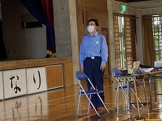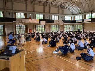 3学年は体育館、1、2学年はオンラインで各教室での参加です。