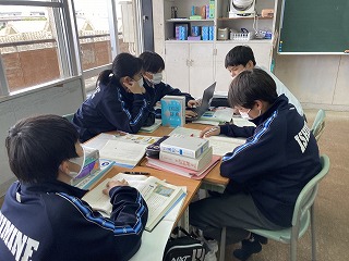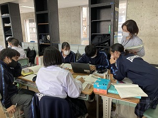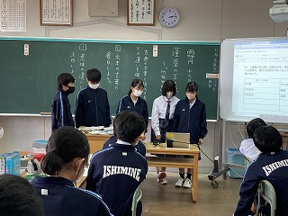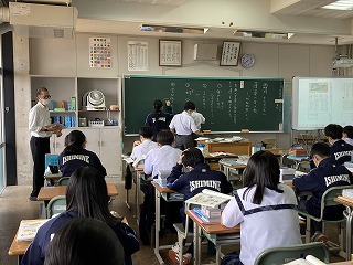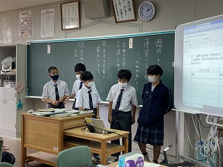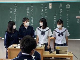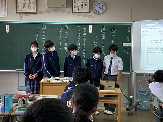 本日5校時、1年5組で新里隆則教諭の研究授業が行われました。古典の授業で「蓬莱の玉の枝-『竹取物語』から」における古典の文章と現代の文章との違いを見つける授業でした。