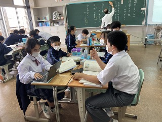 文末の言葉に着目して違いを見つけたり、現代では使われなくなった言葉を探したりして、グループごとにタブレットのシートに記入していきます。それをまとめてグループ全員で発表しました。
