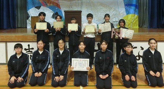 表彰されたのは、アンサンブルコンテスト管打楽器八重奏銀賞の皆さん、実用数学技能検定準2級の皆さん、地区新人テニス大会個人シングル優勝、第3位、ダブルス優勝の皆さんでした。