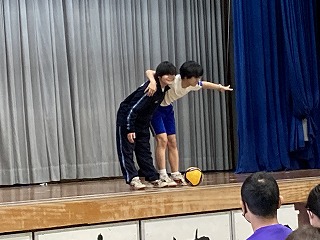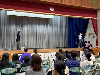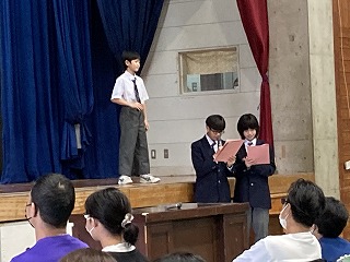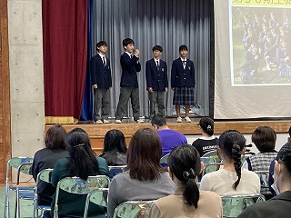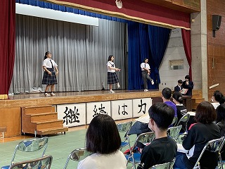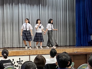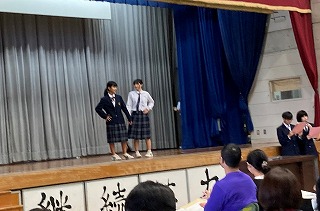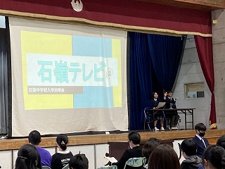 プログラムの始めに、36期生徒会による学校紹介プレゼンと制服ファッションショーが行われました。気合の円陣を組んだのち、ステージ上にアナウンサーとコメンテーターが登場しました。石嶺テレビ@のスタートです。まずはじめに石嶺中の一日ということで、各教科の授業の様子や楽しい給食時間の様子を紹介してくれました。