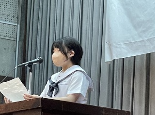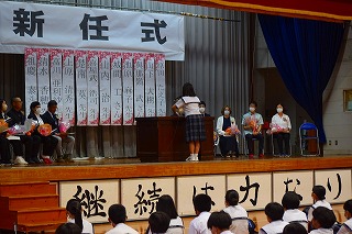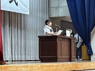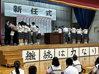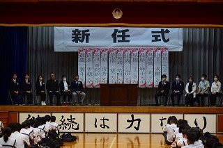 宮平桃花さんが、生徒を代表して石嶺中学校の紹介をしながら新しい先生方へ歓迎のあいさつを行いました。新任職員を代表して初任者として赴任した祖慶先生、清水先生が一緒に息のそろったあいさつをしてくれました。