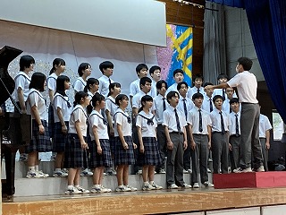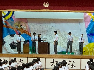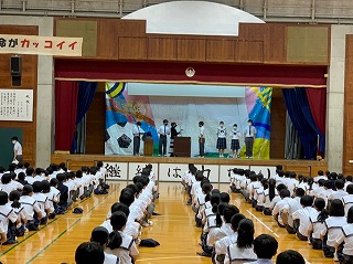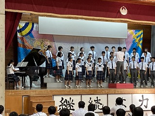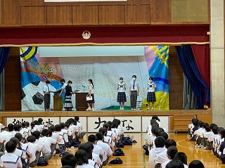 火曜日に引き続き、本日表彰朝会を行いました。今日の朝会は本日なはーとで開催される那覇地区音楽発表会に参加する学級合唱代表クラスの激励会もかねています。