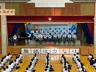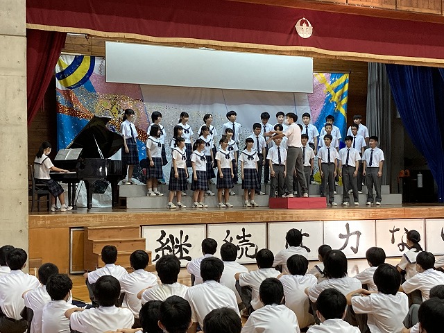 表彰の後、合唱コンクールでグランプリを受賞し本日地区の発表会に出場する3年5組のリハーサルも兼ねて、合唱曲を披露してもらいました。全校生徒を前にして歌うのは初めてですが、1、2年生にとって、3年生の合唱は憧れです。来年、再来年には自分たちもこんなふうに歌いたいときっと思ってもらえたことでしょう。3年5組の皆さん、頑張ってきてくださいね!