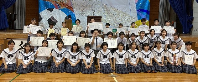 本日表彰されたのは、九州合唱コンクール銀賞の合唱部の皆さん、地域バスケットボール交流試合で優勝した女子バスケットボール部の皆さん、石嶺町旗頭保存会から感謝状を贈られた皆さん、那覇地区科学作品展で金賞、銀賞の皆さん、県児童・生徒科学作品展で優秀賞、優良賞の皆さん、那覇地区陸上大会共通女子走り高跳び3位、宜野湾市ジュニアテニス大会女子ダブルス準優勝、意見発表大会那覇ブロック大会優良賞の皆さんでした。表彰された皆さんおめでとうございます!