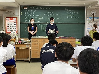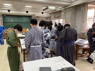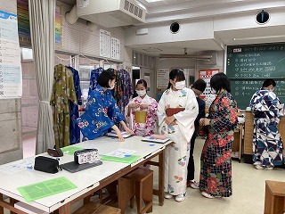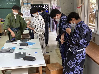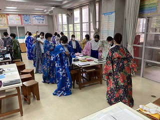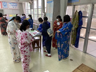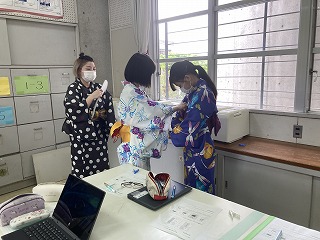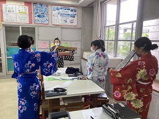 本日3校時は5組、4校時は4組の皆さんが、家庭科の授業でゆかたの着付けにチャレンジしました。講師は京ごふくよしだの狩俣芳美先生と助手の亀川美那子先生です。