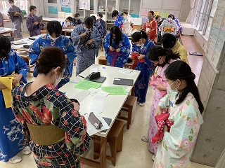 実際にゆかたに袖を通して、男子は貝の口結び、女子は文庫結びを習いました。