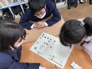 筋道立てて物事を組み立てていく力は、どの教科でも必要な力です。それを一人がわかるのではなく、みんなが「なるほどそーだね」とわかるようにお互いが自然と近い距離で話し合えるのはとても大事ですね。実はこの問題、職員室でも大人気で、先生方も楽しんでチャレンジしていました。そんな様子を見て問題を作った新司先生が一番ニコニコ嬉しそうでした。