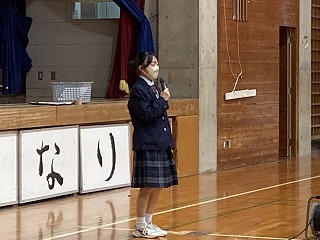 実行委員の玉城慶悟さんが司会進行し、教頭先生からは、一人一人が集団の中でルールを守り、みんなが意識することでよりよい旅行になること、健康安全に気をつけて素晴らしい思い出となる旅行にしてくださいとあいさつがありました。実行副委員長の金城裕花子さんが生徒代表あいさつの中で、名門石嶺中学校の生徒として、一人一人が自覚を持って行動することの大切さや、思い出に残る修学旅行にしましょうと決意を示してくれました。