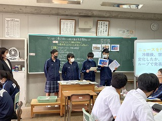 いくつかのグループが、自分たちが選んだ資料で発表してくれました。発表を聞きながらも「グローバル化って何?」など、友達に質問している様子も見られました。