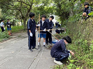 石嶺中学校は那覇地区でも一番緑が多い学校だと思います。三つの門から体育館裏のワルツ通りにかけて、草刈り機や鎌、熊手、高枝切ばさみなど、それぞれの道具を持って、学級の割り当て場所で90分作業が行われました。