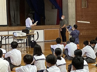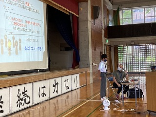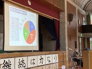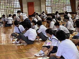 20日(火)の朝から1校時にかけて、県警察本部少年サポートセンターの宮城栄一郎先生を講師にお招きし、少年犯罪防止に向けた講話をしていただきました。体育館に2学年、1、3学年は教室での参加でした。