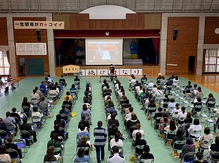 本校進路主任の長嶺有晃先生から、入試までのスケジュールに始まり、推薦入試や一般入試の手続に関する事、学区や各校の定員など様々な説明がありました。多くの情報でしたが、生徒の皆さんにとっては進路決定に向けて気が引き締まる話だったと思います。