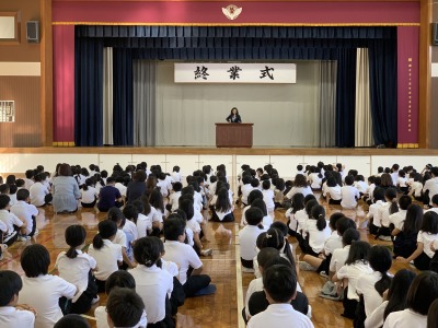 元気いっぱい校歌を歌い、2年生と4年生児童が「旗頭クラブ」や「プールで目を開けること」、「あやとびができるようになったこと」など1学期に頑張ったことを発表してくれました。