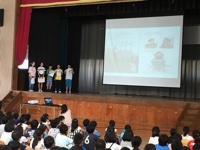 読書月間にちなんで、図書委員会がプロジェクターを使った読み聞かせを朝会で行いました。