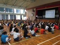 読み聞かせの後は、図書館にある本をクイズ形式で紹介して、読書の楽しさを全児童に伝えていました。