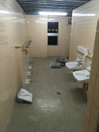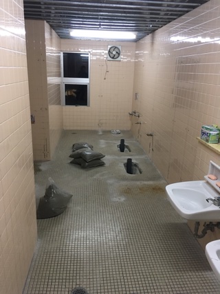 写真は5年生のトイレです。便器と個室の壁が取り外されたところです。