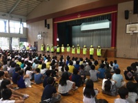 毎週月曜の朝、交通安全の呼びかけを行う交通少年団の引き継ぎ式を全校朝会で行いました。