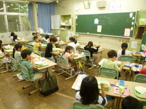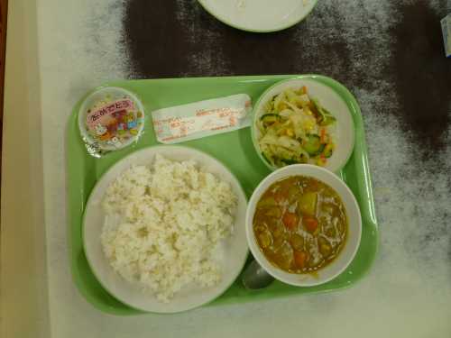 4月15日、入学して初の給食開始でした。メニューはカレー。初を祝って1年生のみデザートの提供です。みんなおいしそうに頬張っていました。