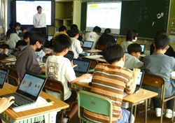 琉球大学4年次の学生:安里光貴さんの卒業授業を活用してのプログラミング学習を6年生が受けました。