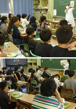 小禄学校給食センターの栄養士:喜瀬さんと饒平名さんによる5・6年生への給食指導がありました。12月の給食の目標「かぜをよぼうする しょくせいかつを みにつけよう」から『かぜ予防の食事について』【心身の健康】の面からお話していただきました。