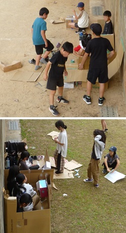 4年生の図工『組んで 立てて つなぐんぐん』で,段ボールを持ち寄り,校庭の好きな場所に秘密基地づくりを行いました。