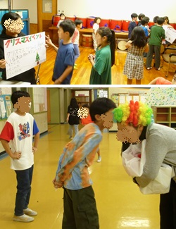 児童会主催による『クリスマスイベント』。クイズに答え,正解したら一文字のヒントをもらいます。全部で8文字あります。その8文字である言葉を作り,正解したらお楽しみが。楽しい取り組みです。