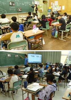垣花小学校で2クラスあるのは,1年生と4年生だけ。その4年生の道徳の学習を1組と2組の先生が交換して行っています。