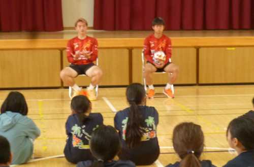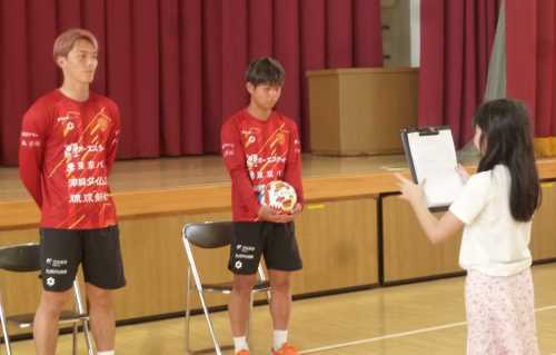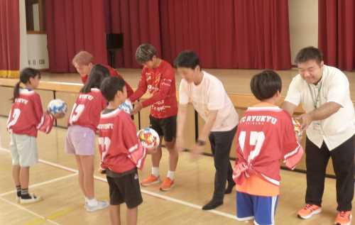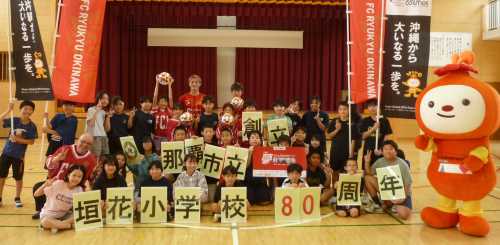 4月21日、FC琉球の選手とトランスコスモスさんが来校し、ボールの寄贈が行われました。その後はプロのスポーツ選手のこどもの頃の話など起質問コーナー、受け取ったばかりの真新しいボールをつかって、ゲームを行い、交流を深めました。本校創立80周年を記念する取り組みの第1号!楽しい企画にみんなの笑顔がこぼれっぱなしでした!