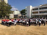 秋晴れの中、1学期の終業式が行われました。体育館が工事のため、運動場で全校児童集まっての朝会でした。
