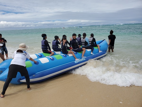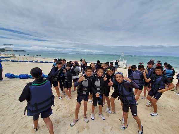 6年生の修学旅行団は,1日目,ネオパークで見学し,お昼のバイキングでは,みんなおいしそうに食べていました。また、マリン体験では,ドラゴンボードを2回のり,満足そうでした。