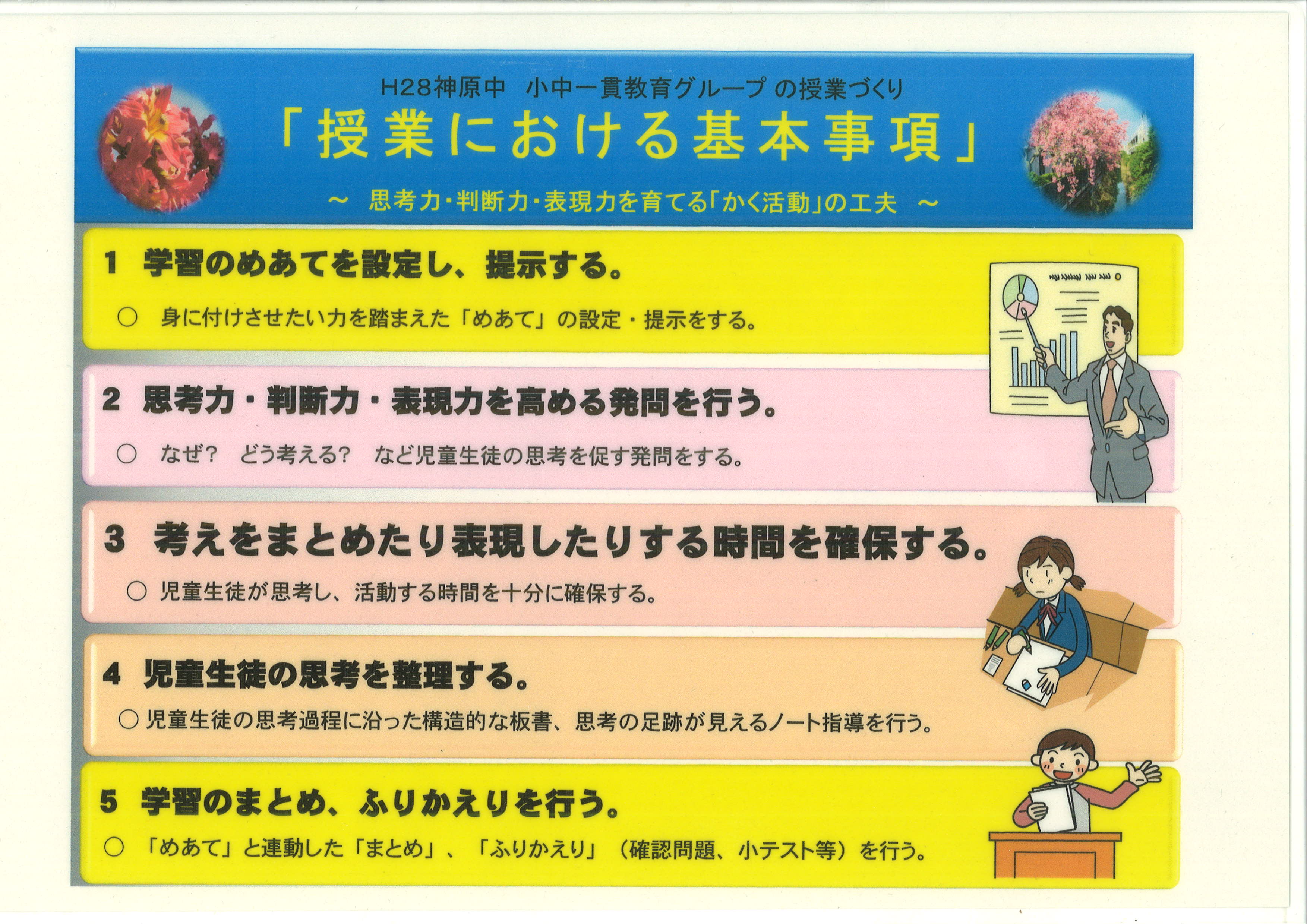 小学校での英語の授業スタイルが踏襲され、小中の接続時期としてスムーズに進められていました。授業後は、神原中ブロックの共通実践事項である、「授業における基本事項」に基づいて、小中の先生方が入り交じり活発な議論が交わされました。