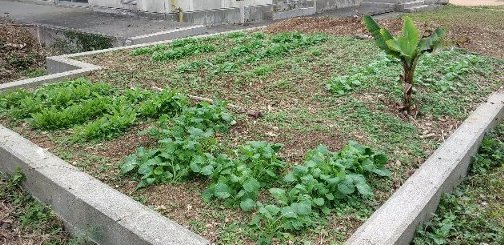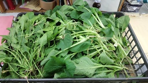 技術教室裏で育てていた野菜の一部が収穫され,5組の生徒達が職員室へ持ってきていました。関連記事→