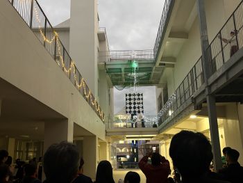 たくさんの生徒が参観し、音楽に合わせて点灯式を行い、