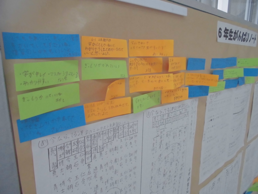 学年の掲示板をみますと、児童の作品がはりだされ、その作品にたくさんのふせん紙がはられています。作品の児童が喜ぶし、ふさん紙に書いた子もうれしいし、みんながみとめてくれし。お友達のよいところをおしえてあげることは気持ちのいいことですね。また、先生もはりだされたノートの作品に、よかったことをコメントとして書いてありました。きっと喜んでいることでしょう。