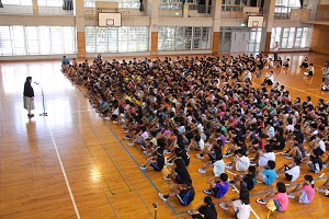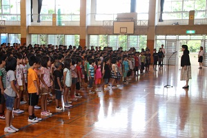 今日の朝会で,校長先生から全校児童へ明日からの夏休みに向けてのお話がありました。