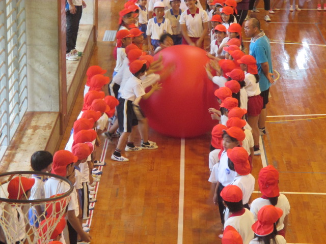 大玉運びでは赤白の大玉がころがされ、歓声が上がりました。ちかいのことばでは運動会のテーマをみんなでいいました。賞品授与は礼儀正しくできました。