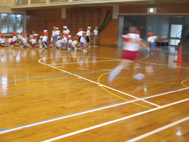 体育館でリレーを行い実際に走りました。室内だけあって走るのが間近に見えますから、臨場感が増し、がぜん盛り上がります。四隅のコーナーの使い方もみんな上手で誰一人ころぶ子はいません。4年生は走るのがあまりにも速すぎて、跳ぶように走りますので写真がぶれました。