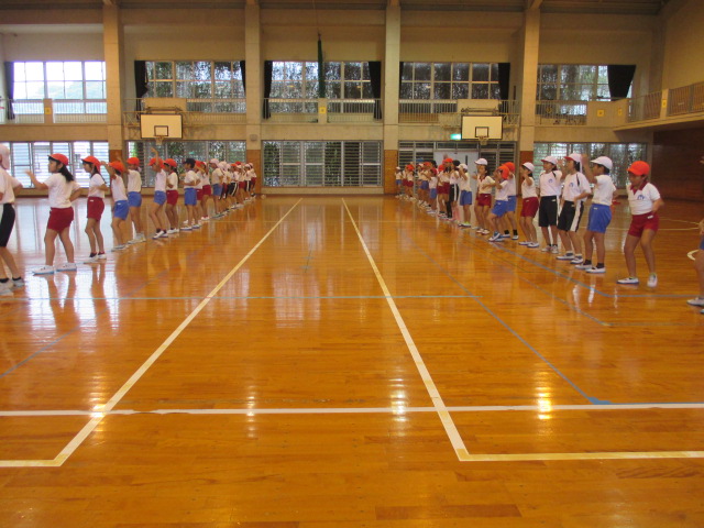 外は小雨、それならば体育館でと運動会練習4年生。