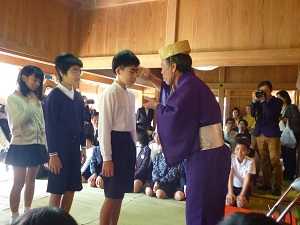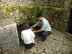 世界遺産識名園で5年生の十三祝いがありました。識名園正門はふだん閉まっていて、昔は王様や貴族などえらい方々をお迎えするときに使ったそうです。その正門が開き、中に入りますと多くの人たちが私たちを迎え入れてくれました。