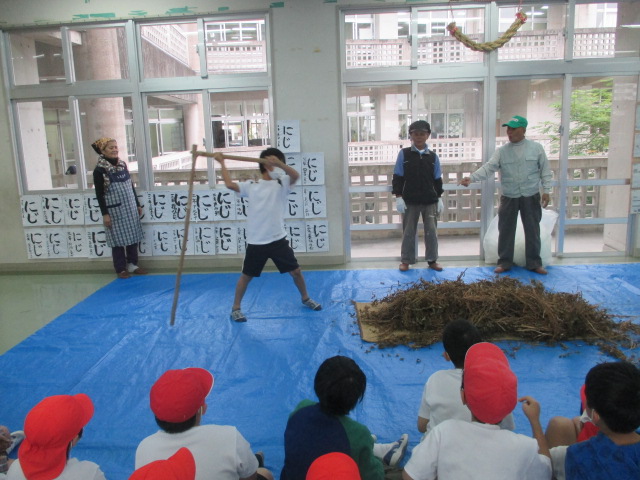 本校の特色ある取組の中に3年生の総合的な学習の時間におけるとうふづくりがあります。その一工程として今日はマーミウチ(豆打ち)を行い、そこでクルマンボーを使いました。