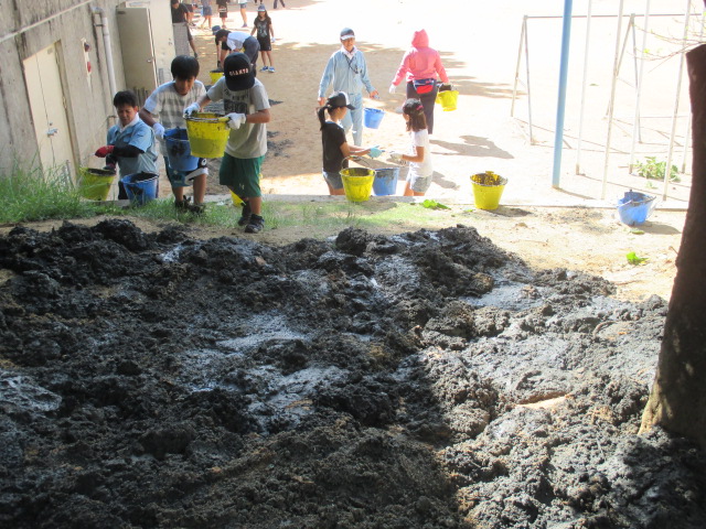 土砂さらい、土の運搬、木の伐採、草刈り等作業は多岐にわたりました。5年児童他大勢の子ども達も参加してくれました。