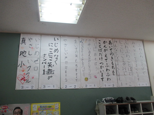 今朝も清掃をして教室に帰る児童の上部にはいじめメッセージ統一テーマが大きく掲げられています。