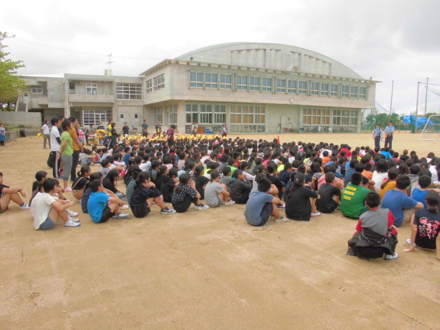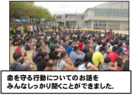 から、真和志高校に全員が避難した時刻は11:15。およそ20分で皆安全に非難する ことができました。集会ではどの子も真剣にお話を聞いていました。