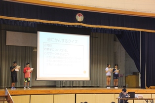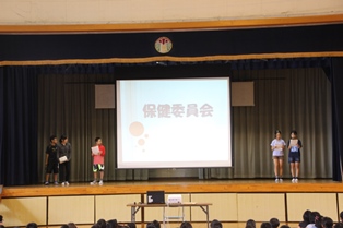むし歯を予防しようということで保健委員会による児童朝会がありました。