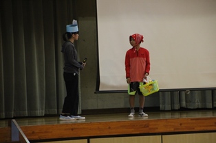 朝会では,最初に保健委員会の紹介がありました。次に本校のむし歯の状況について数字で詳しく説明されました。また、むし歯ができたらどうするか等のクイズは全員参加型で盛り上がりました。最後は劇でオオカミが出てきました。