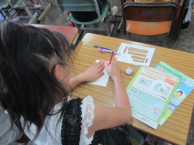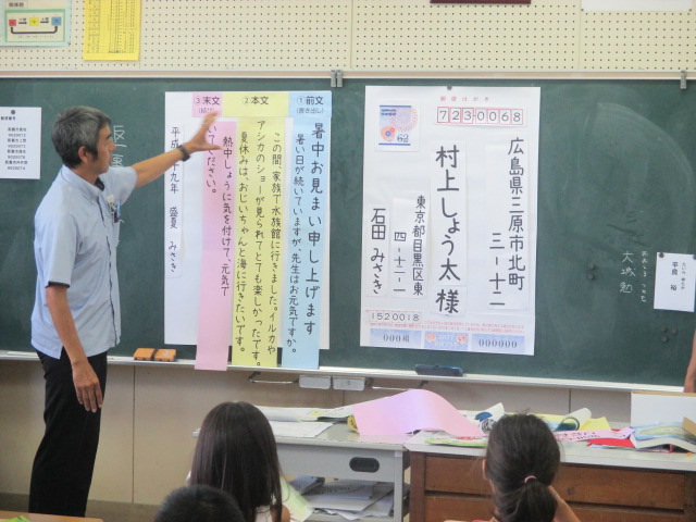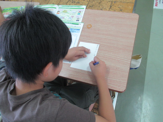 暑中見舞いを実際に書いていました。おじいちゃんやおばあちゃんにこういうふうに書いて出そうとかの声が上がりました。子ども達は宛先の方のことを思い、楽しそうにハガキを書いていました。