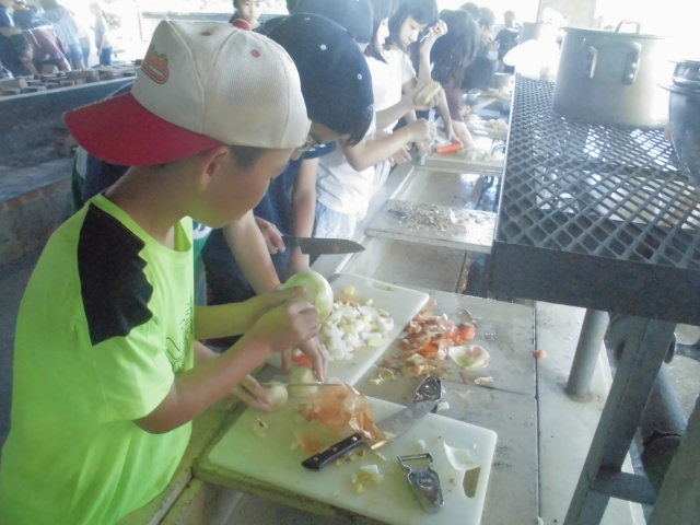 次は飯ごう炊飯活動。男の子一生懸命調理しています。女の子包丁で野菜を切っています。仲間で協力し合い火を焚きます。どちらも目が真剣です。これが体験です、