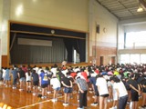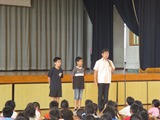最初のお話は、8月に日本と韓国のバレーボール交流大会が韓国で行われました。その大会に真地小学校から二人の児童が日本代表として参加したということです。紹介の中で二人はそれぞれ日韓交流に参加しての感想を述べました。
