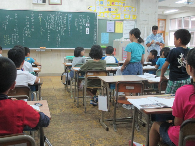 「自由」ということばで思いつくことはなんですかの問いかけで、子ども達からは「なんでもできる」『やりたい放題』「わがまま」とかの声が上がりました。その後、子ども達は「自由」について自分のことにおきかえて一生懸命に考えました。